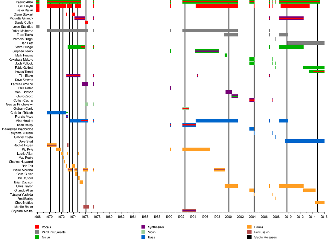 Disbanded Pierre Moerlen founded a new band, first using the name "Gong", before subsequently changing the name to "Gong-Expresso" and finally (starting from 1978) "Pierre Moerlen's Gong". The You & Shamal lineups reformed for a one-off gig in Paris on 28 May 1977. Gong next reformed for a one-off gig in April 1990 on U.K. T.V., with Allen, Smyth, Malherbe & Pyle joined by Here & Now's Stephen Lewry, Keith Bailey & Paul Noble. |