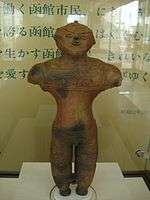 | Hollow clay figure (土偶 dogū)[41][42] | At 41.5 cm (16.3 in) biggest hollow clay figure in Japan | late Jōmon period, 2,000–1,000 BC | Chobonaino (著保内野) site, Minamikayabe (南茅部町 minamikayabechō) (now Hakodate), Kayabe District, Hokkaidō | Hakodate city Board of Education, Hokkaidō | ![]() |