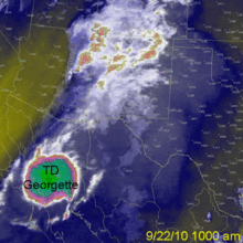 - September 22, 2010 – Moisture from the remnants of Tropical Storm Georgette in the eastern Pacific combined with an approaching upper-level trough to produce heavy rainfall and thunderstorms across the state. A total of 6.42 in (163 mm) was reported in Gladstone.[66] The rains caused flooding that killed a person along the Rio Grande near Carnuel.[67]