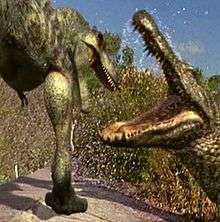 In the park, near the Time Portal site there is a crocodile enclosure. There is a suspension bridge across it (the simple sort where the footway follows the catenary); Bob walks across it to feed the Nile crocodiles in the lake. Nigel plans to add a Deinosuchus, an ancient species of giant crocodilian (more closely related to alligators than crocodiles) which weighs up to 9 tons, to the park. Bob mutters that Nigel may have bitten off more than he can chew this time. In a jeep, Nigel goes through the Time Portal to the Cretaceous in Texas, where Dallas is now. At this time North America is divided into three land areas by a Y-shaped internal epicontinental sea. The land around the Time Portal exit point is dry: gravelly sand with patches of trees and bushes. Two half-size juvenile Parasaurolophus go by and stop about 10 m away. Nigel chases them towards the jeep. Then two Albertosaurus appear. The Parasaurolophus honk and run away. Nigel revs his jeep's diesel engine: that makes the Albertosaurus back off, but not for long and they get accustomed to the noise (and presumably to diesel exhaust smell). He drives away. They chase him, at speed up to 30–38 mph, but they tire and turn away. In the park, Bob is planting young trees to help feed the titanosaurs: he says that he will have to plant 2000 trees each year for this. The titanosaurs, of course, are no help whatsoever at this, and keep trampling trees down. The Smilodon have bred and now have two cubs. Susanne sees that their mother is not making enough milk for the cubs, so she has to take the cubs and bottle-feed them, thus breaking the natural mother-cub link. If she were to put them back into their mother's enclosure, they would be killed. On site, Nigel drives onto a sea beach, and looks out to sea for signs of Deinosuchus which could survive for a limited time in salt water like modern saltwater crocodiles. He stops. A herd of Parasaurolophus run past. They are each 10 meters long. He shouts at them to clear off in case they damage his jeep's paintwork. He finds a conch-sized gastropod shell and makes a hole in it and blows it to try to have an exchange of vocalizations: they make noises using their hollow crests. Nigel, with binoculars, sees 5 Nyctosaurus fly in from the sea. They fish by skimming the lower jaw through the water surface. Nigel has brought a microlight with him: he uses it to fly with the Nyctosaurus. A Deinosuchus reaches its head out of the sea and grabs one of the Nyctosaurus. Nigel sees another Deinosuchus swimming from the sea up a river, and decides to head in that direction. In the park, Susanne visits Martha the Mammuthus. Martha tries to be an "auntie" to the elephant herd's matriarch's calf. The frightened matriarch drives Martha away. Martha is becoming isolated again, and there is fear that she will again stop eating. On site, Nigel paddles in a red inflatable boat on the river. A Deinosuchus bites the boat's stern, does not like the taste of rubber, and lets go. It snaps out of the water again by the boat, then disappears. Nigel paddles two miles upstream to a freshwater lake, where he sees some Deinosuchus on a sandbank, and a herd of Parasaurolophus forced by thirst to come to the lake to drink. Nigel paddles. He mentions that Deinosuchus will (geologically) soon be wiped out when sea floods the area, as they have a specialised lifestyle, so he must rescue one. An unwary young Parasaurolophus goes to the lake to drink. A Deinosuchus rockets out of the lake and grabs it by the chest. The two roll over and over in the lake. More Deinosuchus swim in. They take turns to hold the kill while another tears at it. In the park, the Phorusrhacos has developed a habit of dust bathing near its enclosure's fence, undermining it. Each time, Bob fills the resulting hole with big stones. He realises that this tactic is only "firefighting" and that he will have to make a new fence with the bottom ends of all its posts buried four feet deep. On site, Nigel has made a long double row of wooden posts ending in a blind end. He plans to entice a Deinosuchus with meat up the fenced route to the blind end. To get back to the jeep, he walks through a dense forest, but he is worried about dangerous predators. Something is following him. He feels relieved when a Troodon sticks its head up out of bushes and shows that it is much smaller than an Albertosaurus. When he reaches the jeep, he sees that three Troodon are eating the meat that he had brought as bait. He chases them away using a portable aerosol-like horn. In the park Bob is shoveling up Elasmotherium dung when he sees the Phorusrhacos looking at him through a fence. He calls on his walkietalkie that the Phorusrhacos has escaped again. A keeper comes in a jeep, and by towing some meat behind the jeep leads the Phorusrhacos back to its enclosure. On site, Nigel plans to use the rest of his meat to bait a Deinosuchus up the stockade. He sets the bait at the stockade's end. They rig hammocks. It gets dark. With their helmet headlights they see that some a Troodon was pulling away his bait. When Nigel chased after it, another came and ran off with the rest. The meat that was left was not enough to lure a Deinosuchus. They go to bed. They are woken in the morning by the noise when three Albertosaurus kill a Parasaurolophus. Three Deinosuchus come out of the lake to steal the kill. There is noisy confrontation and some biting, and tugs-of-war over the flesh. The Albertosaurus admit defeat and back off. In the park Martha the mammoth is still isolated from the elephant herd. On site, Nigel must use himself as bait. He wades into the water and splashes it hard with a paddle until a Deinosuchus investigates. He backs off too soon; the Deinosuchus backs off. He splashes again. The Deinosuchus charges out of the sea and chases Nigel, who runs up the stockade path and at its blind end squeezes between two of its posts. He and 4 men with him struggle to hold the stockade posts u
