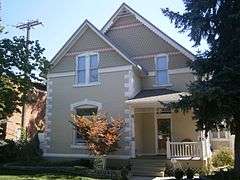 Romanesque Revival; polychrome masonry; one of three contributing buildings in Wolcott Square Historic District |
