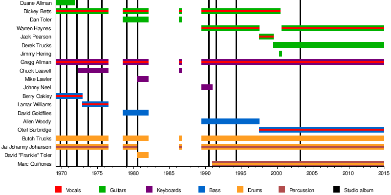 Gregg Allman and Butch Trucks are the only members of the band to appear in all of its lineups. In 2014, the group dissolved with the departure of Haynes and Derek Trucks.[1] *Note: Release contributions do not include the bands retrospective live albums.
