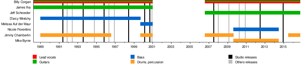 Corgan, BillyBilly Corgan | 1988–2000, 2006–present | lead vocals, guitars, bass, keyboards | All of The Smashing Pumpkins' releases. |