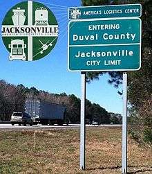 To emphasize the city's transportation capabilities, the Jacksonville Regional Chamber of Commerce filed "Jacksonville America's Logistics Center" as a trademark on November 9, 2007. It was formally registered on August 4, 2009.[3] Cornerstone began promoting the city as "Jacksonville: America's Logistics Center" in 2009. Signs were added to the existing city limit markers on Interstate 95.[4]