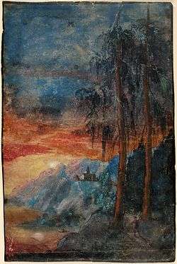 Only five surviving landscape paintings are generally accepted to have been painted by Altdorfer.[2] Two of them, 30.5 × 22.2 cm one in Munich and 41.2 × 35.5 cm one in London, were painted in oils on parchment glued on wood.[3][4][5] The other three, in Berlin, Erlangen, and Rotterdan, all just over 20 × 13 cm, were painted in watercolour and gouache on paper.[2][6][7][8][9] All five are signed with Altdorfer's monogram AA (see below). The painting in Rotterdam is also dated 1522 by the artist.[9][10]