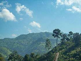 Unofficially the highest peak of Bangladesh is Saka Haphong at Mowdok range.[2][3] on the border with Myanmar. In February 2006 a GPS reading of 1,064 metres was recorded on this summit by English adventurer Ginge Fullen. The location he recorded, 21°47′11″N 92°36′36″E / 21.78639°N 92.61000°E, accurately matches the location given by Russian topographic mapping and SRTM data, although these sources show its height to be slightly lower, at 1,052 metres. However, SRTM data has been demonstrated to have about 5-9m vertical accuracy, while most tracking grade handheld GPS receivers also have several meters of vertical inaccuracy. Only accurate DGPS or RTK-GPS survey, or airborne LIDAR/photogrammetric survey can yield more accurate result. Recently two trekking clubs counted the height of "Saka Haphong" as 3,488 and 3,461 feet respectively. Any of these two figure would make it the highest mountain in Bangladesh exceeding the height of Keokaradong, which is 3,172 feet high.[4] This peak is also known as Mowdok Taung (as per USGS Topo and Russian Topo map), Saka Haphong (by local Tripura tribes). Mowdok Taung was the official name that appeared in all British India topographic maps of 1938, 1939 and 1948 which is also reflected in US Army Corps of Engineers Map of 1954. Because no name change notification by the governments of India till 1947, government of Pakistan till 1971 or the Government of Bangladesh afterward was found anywhere, 'Mowdok Taung' still presumably remains as the official and the most authentic name for this peak. Since 2007 till now route to Saka Haphong is the most desired trekking route for adventure lovers in Bangladesh.