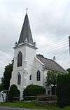 After the English Reformation, Roman Catholic worship was illegal in England for nearly 250 years until 1791,[25] and it grew slowly thereafter in comparison to West Sussex, where many large estates were owned by gentry who secretly kept the faith over many generations.[26] Ill-feeling towards Catholics apparently persisted well into the 19th century in Battle, where the 1886 Church of Our Lady Immaculate and St Michael was set well back from the street (in the garden of its presbytery) and does not have an ecclesiastical appearance.[27] In the early 20th century, bolder architectural statements were made with the Gothic Revival church at Bexhill-on-Sea and the elaborate Italian Romanesque-style church at Rye, both of which are listed buildings.[28][29] Most of the other Roman Catholic churches in Rother district are simple mid-20th-century buildings, sometimes with distinguishing architectural features such as a modernistic portico-style entrance at Sidley,[30] dalle de verre glass at Burwash[31] and a Mediterranean-style blank-arcaded tower at Little Common.[32]