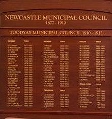 The first election was held at the Newcastle Court House on 15 February 1871 for seven members. The resident magistrate (W. J. Clifton) presided, and Arthur Edwardes Growse was elected as the district's first chairman.[7] Most elections from 1872 until the beginning of the 20th century were held on the third Friday in December in accordance with section 9 of the District Roads Act 1871. Later acts changed this to the third Thursday in March (Roads Act 1902) and the second Saturday in April (Road Districts Act 1919). Until 1919, chairmen were directly elected by ratepayers; after this, they were elected at the first meeting following an election by a majority of councillors.