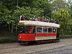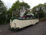 Derby Corporation Tramways | 1 | On Display | Green and Cream | 1904 | 45 | This tram has never run at Crich as it is to a non-standard (4 feet (1,219 mm)) gauge. It was used for crew training prior to the opening of the electrified system in Derby where it ran for 30 years. When Derby 1 was originally restored, it was done so on the standard gauge truck from the Blackpool "Gondola" illuminated car. When it was seen in Osmaston Road Depot in Derby, its wheels were in only one of the tram tracks. It is notable for its drooping body, the bodywork is ill-fitting to the trucks, so this has led to the body to curve at both ends. On display in the Exhibition Hall.