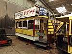 Blackpool Electric Tramway Company | 4 | On Display | Orange, Green and White | 1885 | 32 | This is the oldest electric tram at Crich and used the conduit method of current collection. It was converted to a works car with a trolley pole, and restored in the 1960s. To simulate conduit running, it was fitted with a new, home-built truck powered by lead acid batteries. It ran for the 50th anniversary of the TMS, though not carrying passengers. On display in the Exhibition Hall.