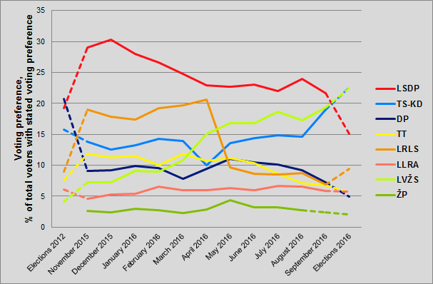 - ↑ "Finišo tiesioji: skelbiami partijų reitingai" [Finishing straight: party ratings announced]. delfi.lt (in Lithuanian). 14 September 2016. Retrieved 13 September 2016.