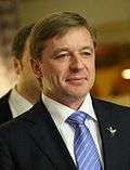 Lithuanian Peasant Popular Union rebranded itself as the Lithuanian Peasant and Greens Union (LVŽS) in 2012. Led by businessman Ramūnas Karbauskis, the party received 6.6% of the vote in the European Parliament elections in 2014, earning a single mandate, and emerged as a dark horse in the electoral race in the spring of 2016. The rise of LVŽS was attributed to the popularity of Karbauskis, who had been active in campaigning against alcohol, and their lack of involvement in political scandals.[51] LVŽS was further boosted by the announcement that Saulius Skvernelis, a Minister of Interior in Butkevičius Cabinet and one of the most popular politicians in Lithuania, would head the party's electoral list in the elections, without joining the party.[52][53] Before the elections, the party ruled out the possibility of participating in a ruling coalition which involved Labour or Order and Justice.