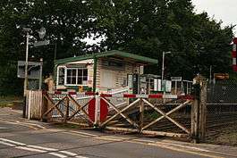 There is a level crossing at the eastern (London) end of the platforms, where the line crosses Rusper Road. The crossing gates were considered for replacement with modern barriers in the early 1990s but as there was a history of late passengers running over the crossing to catch their train it was dismissed. Therefore, the adjacent signal box was manned 24 hours a day. In October 2012 the level crossing was rebuilt and automatic barriers installed to replace the old fashioned gates. This meant that the crossing operator's job was now redundant, with CCTV used to control the crossing from the Three Bridges signal centre.[1] This upgrade was finally made necessary due to a number of incidents of people driving through the wooden gates when closed, resulting in expensive replacement gates having to be constructed.[2][3]