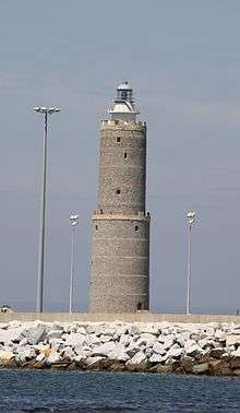 The lighthouse is called Fanale dei Pisani, for the reason that was built by the Pisans in 1303 on project attributed to Giovanni Pisano and by the master builders Rocco Entello De Spina and Bonaggiunta Ciabatti whose names were found engraved on a stone.[2] The lighthouse was built on an emerging rock surrounded by the sea at the south entrance of the harbour; it is formed by a polygonal basement of 13 sides over which is placed the tower formed by two cylinders both with an embattled balcony and the lantern on the top. It consists of 11 floors, connected each other by a spiral staircase up to 53 meters, every floor is 3.72 meters high expect the first and the second respectively 5.55 and 4.22 meters.[3] The lower part is made of four cylinders of decreasing diameter and the upper part of three which makes thin the tower toward the summit.