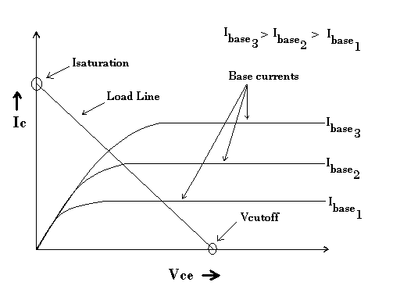 The load line diagram at right is for a transistor connected in a common emitter circuit. It shows the collector current in the transistor IC versus collector voltage VCE for different values of base current Ibase. The load line represents a particular value of collector load resistor (RC). The intersections of the load line with the transistor characteristic curve represent the different values of IC and VCE at different base currents.