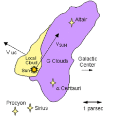 Diagram of the local clouds of matter that the Solar System is moving through, with arrows indicating cloud motion.