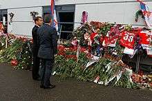 Russian President Dmitry Medvedev, who had been on his way to Yaroslavl for the Yaroslavl Global Policy Forum, sent his condolences to the families of those killed in the crash,[31] and visited the crash site along with Governor of Yaroslavl Oblast Sergey Vakhrukov.[4][32] René Fasel, president of the International Ice Hockey Federation, called the crash "the darkest day in the history of our sport."[33] Manchester United chief executive David Gill wrote to the Russian side to offer support and sympathy after hearing of the tragedy, which bore unsettling similarities to the Munich air disaster which cost 23 United players, staff and journalists their lives in 1958.[34] Yaroslavl announced a three-day period of mourning from Friday 9 September 2011 to Sunday 11 September 2011.[20]