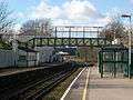 Westward view of the platforms. The footbridge is primarily a public right of way; the station has its own subway for passenger use (the dark-roofed lean-to on Platform 1 is its entrance)