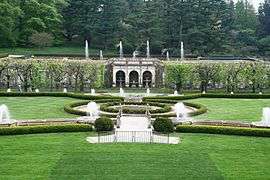 From 1925-27 Pierre designed and constructed the Italian Water Garden on a site northeast of Longwood’s Large Lake, after gaining inspiration from a visit to the Villa Gamberaia, near Florence, Italy.[18]
