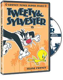 "Looney Tunes Super Stars' Tweety & Sylvester: Feline Fwenzy is a DVD of fifteen Sylvester and Tweety cartoons that was released on November 30, 2010.[1] Unlike the previous Super Stars discs, this disc features fifteen cartoons that were previously on the Golden Collection sets as the new plan for the Super Stars volumes is one with new-to-DVD cartoons and one with previously-on-DVD cartoons. The reason for the double-dip release in each wave is so the Warner Home Video department can pay back for the remastering of other restorations.[2] Also, unlike the previous Super Stars discs, the cartoons are presented in original full screen.