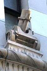 | Norway House.[47] | Cockspur Street London | In London and above Norway House in Cockspur Street, by Trafalgar Square, there are four reliefs by Roslyn. The building was designed in 1914 and at the time no particular tenant had been identified so there is no particular reference in the reliefs to Norway itself. The compositions cover the themes of "Industry", "Transport", "Communications" and "Commerce".[48] In the photograph to the left a woman sits spinning and factory chimneys belch out smoke, The relief dedicated to "Industry". |