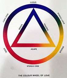 The color wheel theory of love is an idea created by Canadian psychologist John Alan Lee that describes six styles of love,[1] using several of the Greek words for love. First introduced in his book Colours of Love: An Exploration of the Ways of Loving (1973), Lee defines three primary, three secondary and nine tertiary love styles, describing them in terms of the traditional color wheel. The three primary types are eros, ludus and storge, the three secondary types are mania, pragma and agape.