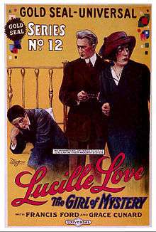 Lucille Love, Girl of Mystery is a 1914 American action film serial directed by Francis Ford. It was the first serial by Universal. It was originally intended to be a short subject. The serial is now considered to be lost with only four episodes surviving.[1]