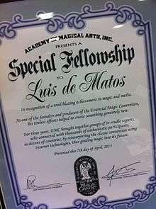 In 2013 Luis de Matos receives in Los Angeles, his third award by the Hollywood Academy of Magical Arts, the “Special Fellowship Award" where the following is engraved: