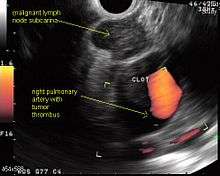 - 1 2 3 Micames CG, McCrory DC, Pavey DA, Jowell PS, Gress FG (February 2007). "Endoscopic ultrasound-guided fine-needle aspiration for non-small cell lung cancer staging: A systematic review and metaanalysis". Chest. 131 (2): 539–48. doi:10.1378/chest.06-1437. PMID 17296659.