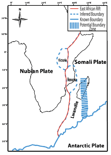 For many years it was widely accepted that rifting in the East African Rift system, 22–25 million years ago, resulted in the splitting of the African Plate into 2 smaller plates – the Somali Plate and the Nubian Plate.[7] However, most recently, through the application of GPS technology and integration of earthquake data, it was discovered that the rift created three additional “micro-plates” plates – the Lwandle Plate, Victoria Plate, and Rovuma Plate.[1]
