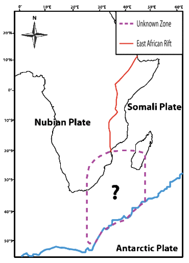 Earthquakes occur most often at plate boundaries and have been used as a guide to predict the locations of multiple plate boundaries.[8][9] “Lwandle’s” existence was postulated after studying earthquake data in areas that were once assumed to be the interiors of the Nubian and Somali plates.[10] By including the Lwandlean Plate in their calculation, researchers were able to more accurately solve for the intersection between the East African Rift and the Southwest Indian Ridge.