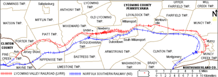 The line runs generally west between Muncy (in Lycoming County) and Avis (in Clinton County). Other communities served include Montoursville, Williamsport (and its western neighborhood of Newberry), the unincorporated village of Linden (in Woodward Township) and Jersey Shore (all in Lycoming County). 37 miles (60 km) of track are in Lycoming County and 1-mile (1.6 km) is in Clinton County.