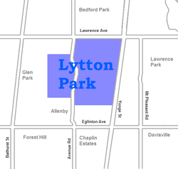 Lytton Park is a neighbourhood in Toronto, Ontario. It is located in the "North Toronto" municipality, within the former city of Toronto (Old Toronto). The neighbourhood is centered on 'Lytton Park' (hence the name). Its boundaries include: Mona Drive to the west, Yonge Street to the east, Lawrence Avenue West to the north and Briar Hill Avenue to the south.