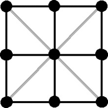 There are two board variations. Both are 3x3 square grids. One variant is simpler, with only orthogonal lines connecting the adjacent intersection points of the board. The other variant has left and right diagonal lines that connect the opposite corners of the board.