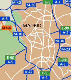 The M-30 orbital motorway circles the central districts of Madrid, the capital city of Spain. It is the innermost ring road of the Spanish city, and the length is 32,5 km. Outer rings are named M-40, M-45 and M-50.