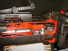 In order to address these issues, a contest was held for a true MG 34 replacement. Three companies were asked to submit designs: Metall und Lackierwarenfabrik Johannes Großfuß AG of Döbeln, Rheinmetall-Borsig of Sömmerda, and Stübgen of Erfurt.[9] Of the number of proposals submitted, Großfuß AG's proved to be the best design by far, employing a unique recoil-operated roller locking mechanism whereas the two competing designs used a gas-actuated system.[9] Interestingly, the company had no earlier experience in weapons manufacture, specializing in pressed and stamped steel components (the company's staple product was sheet metal lanterns). Dr.-Ing. Werner Gruner, one of the leading design engineers with Großfuß, knew nothing about machine guns when he was given the task of being involved with the project, although he specialized in the technology of mass production. Gruner would attend an army machine gunner's course to familiarize himself with the utility and characteristics of such a weapon, also seeking input from soldiers. He then recycled an existing Mauser-developed operating system and incorporated features from his experiences with army machine gunners and lessons learned during the early stages of the war.[9] Being made out of stamped metal, the new design required considerably less tooling and was much simpler to build than other machine guns—it took 75 man hours to complete the new gun as opposed to 150 man hours for the MG 34 (a 50% reduction), and cost 250 RM as opposed to 327 RM (a 24% reduction).