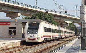 ![]() A Renfe Operadora 449 series train making a service on Rodalies de Catalunya regional line R11 at the station in 2013. Note the viaduct of the Madrid–Barcelona–Figueres high-speed rail line crossing the station diagonally on the background. | |||||||||||||||||||||||||