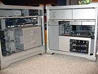 From 2006 through 2012, the exterior of the Mac Pro's aluminum case was very similar to that of the Power Mac G5, with the exception of an additional optical drive bay, and a new arrangement of I/O ports on both the front and the back. The G5 has the added feature of plastic covering that protects the internal hardware. You can also remove the exterior covering to display the interior, as the plastic will keep everything inside protected. . The case could be opened by operating a single lever on the back, which unlocked one of the two sides of the machine, as well as the drive bays. All of the expansion slots for memory, PCIe cards and drives could be accessed with the side panel removed and no tools were required for installation.[20] The Xeon processors generated much less heat than the previous dual-core G5s, so the size of the internal cooling devices had been reduced significantly. This allowed the interior to be re-arranged, leaving more room at the top of the case and doubling the number of internal drive bays. Less heat also meant less air to move out of the case for cooling during normal operations; the Mac Pro was very quiet in normal operation, quieter than the much noisier Power Mac G5,[21] and proved difficult to measure using common sound pressure level meters.[22]