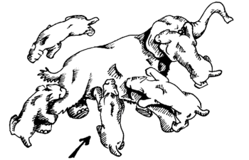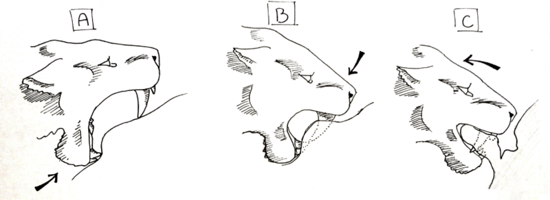 For this technique to work, a specific sequence of motions would have be followed. First, the animal must be completely subdued, and the predatory machairodonts must to be social, so that several individuals can hold the prey animal down. The individual preparing to deliver the killing bite would open its mouth at maximum gape, and with its mandible, press up on the skin of the belly. Creating a depression where the lower canines and incisors press into the skin, a slight fold is created in the skin above the lower teeth as the mandible is shoved upward. Next, the upper canines are pressed into the skin and the muscles of the neck are used to depress the head, so instead of pulling the jaw 'up', the skull is pressed 'down' . When the canines pierce the skin, they are lowered until the gape of the mouth is roughly 45°, where the mandible is pulled up in addition to the skull still being depressed. The small flanges on the anterior portion of the mandible of most machairodonts would be used to aid the depression of the skull. When the animal's mouth is closed, it holds a thick flap of skin between its jaws, behind its canines, and the animal uses the muscles of its lower back and forequarters to pull back, tearing the flap clear of the body. This large gash, once opened, leaves intestines uncovered and arteries and veins torn. The bleeding animal would die within minutes, and the shock of repeated bites, tearing innards from the body, could speed up the process.[53]