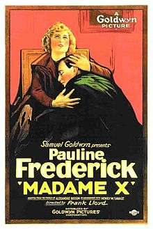 Madame X is a 1920 American silent drama film directed by Frank Lloyd and starring Pauline Frederick. The film is based on the 1908 play Madame X, by French playwright Alexandre Bisson, and was adapted for the screen by J.E. Nash and Frank Lloyd.[1] A copy of this film survives in the George Eastman House Motion Picture Collection.[2]