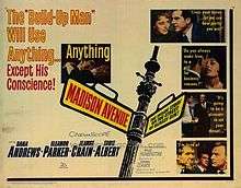 Madison Avenue is a 1961 CinemaScope film directed by H. Bruce Humberstone starring Dana Andrews, Jeanne Crain and Eleanor Parker. The film was completed in 1960 but was not released immediately. On April 13, 1961, Madison Avenue opened at the Rialto Cinema in London's West End for a two-week run.[1] In late April, the film had a UK general release as part of a double bill with The Little Shepherd of Kingdom Come.[2] The film was not seen in the United States until January 1962.