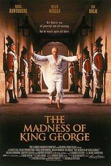 The Madness of King George is a 1994 British biographical historical comedy-drama film directed by Nicholas Hytner and adapted by Alan Bennett from his own play, The Madness of George III. It tells the true story of George III of Great Britain's deteriorating mental health, and his equally declining relationship with his eldest son, the Prince of Wales, particularly focusing on the period around the Regency Crisis of 1788–89. Modern medicine has suggested that the King's symptoms were the result of acute intermittent porphyria, although this theory has more recently been vigorously challenged, most notably by a research project based at St George's, University of London, which concluded that George III did actually suffer from mental illness after all.[3]