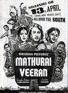Madurai Veeran (English: The Warrior of Madurai) is a 1956 Indian Tamil-language film directed by D. Yoganand, starring M. G. Ramachandran, Bhanumathi Ramakrishna and Padmini. It was released on 13 April 1956 and completed a 100-days-run in all the 40 theatres it was screened at.[1]