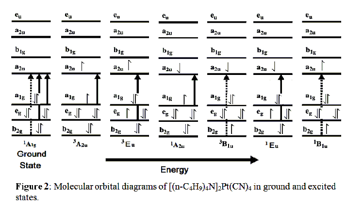 To have an A- and B-term in the MCD spectrum, a molecule must contain degenerate excited states (A-term) and excited states close enough in energy to allow mixing (B-term). One case exemplifying these conditions is a square planar, d8 complex such as [(n-C4H9)4N]2Pt(CN)4. In addition to containing A- and B-terms, this example demonstrates the effects of spin-orbit coupling in metal to ligand charge transfer (MLCT) transitions. As shown in figure 1, the molecular orbital diagram of [(n-C4H9)4N]2Pt(CN)4 reveals MLCT into the antibonding π* orbitals of cyanide. The ground state is diamagnetic (thereby eliminating any C-terms) and the LUMO is the a2u. The dipole-allowed MLCT transitions are a1g-a2u and eg-a2u. Another transition, b2u-a2u, is a weak (orbitally forbidden singlet) but can still be observed in MCD.[14]