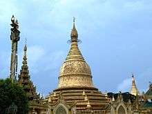 The Maha Wizaya Pagoda (Burmese: မဟာဝိဇယစေတီ, Māha Vijaya Cetiya) is a pagoda located on Shwedagon Pagoda Road in Dagon Township, Yangon, Myanmar. The pagoda, built in 1980, is located immediately south of the Shwedagon Pagoda on Dhammarakhita Hill.[1] The enshrined relics were contributed by the King of Nepal, while the pagoda's hti (umbrella) was consecrated by Ne Win, the country's former leader.[2] The construction of this particular pagoda is believed by some scholars to have been a form of merit-making on the part of Ne Win.[3]