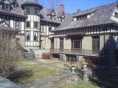 Major's Inn and Gilbert Block is a historic inn and tavern and commercial building located at Gilbertsville in Otsego County, New York. The Gilbert Block consists of three 2-story attached brick commercial structures varying slightly in height in the Neo-Tudor Style. It was built between 1893 and 1895, and hosts shops and artist’s studios. It was designed by Boston architect Henry Forbes Bigelow. Major's Inn was started in 1896 and finished in 1917 on the site of the original 1822 Gilbert homestead which burned in 1895. It is a 3 1⁄2-story structure with a gable roof covered in slate, interrupted by a number of chimneys, dormers, and conical roofs on towers. It has a rambling effect accented by the use of a variety of projecting balconies and bays, towers, and several porches. The medieval English Tudor and Gothic building was commissioned by Major James L. Gilbert using Augustus Nicholas Allen to construct it. Decorative elements on both buildings incorporate the quatrefoil.[2] The Inn went through a series of owners during the 1950s to 1970s and, beginning in 1980, a group founded by Alan Cleinman which became the Major's Inn Foundation, Inc. began to raise funds for the purchase of the property. Today, under the ownership of the Foundation, the Major's Inn has been significantly restored and serves as a cultural center.