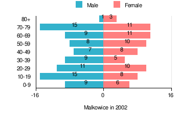 According to the 2002 Poland census, there were 156 people residing in Malkowice village, of whom 53.8% were male and 46.2% were female. In the village, the population was spread out with 19.9% under the age of 18, 32.7% from 18 to 44, 17.9% from 45 to 64, and 29.5% who were 65 years of age or older.[1]