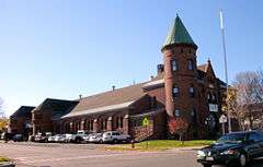 Malone Armory is a historic National Guard armory building located at Malone in Franklin County, New York. It is a brick and stone castle-like structure built in 1892, designed to be reminiscent of medieval military structures in Europe. It was designed by State Architect Isaac G. Perry. It consists of a 2-story, steeply pitched hipped roofed administration building with an attached 1 1⁄2-story, gable-roofed drill shed. The building is built of Potsdam sandstone and features a 3 1⁄2-story round tower on the administration building.[2]