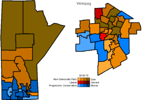| Map of Manitoba with the ridings coloured to indicate the winning parties and their popular vote | |||||||||||||||||||||||||||||||||||||||||||||||||||||||||||