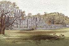 Margam Park owes its location and beginnings to the monastery, which was acquired by Sir Rice Mansel in 1540 after the Dissolution of the Monasteries in 1537. A Tudor mansion was later built on the site of the former monastic ranges by Sir Rice Mansel as a county residence. In 1661, the first mention of a garden is referenced, including walled areas and by 1727 the estate's gardener drew up a catalogue of the plants at the gardens. 1793 saw the completion of the Orangery, the masterpiece of eighteenth century architect Anthony Keck,[1] and by the late 18th century the gardens were fenced off from the park to keep out the deer, and a main gate was erected. An 1814 estate map shows that a working park had been realised, with a 'Great', 'Little' and 'Upper' Parks, and by 1830 the construction of a new manor house, to become Margam Castle, had begun. Before the end of the decade, plans show the inclusion of several new buildings and features, including the Temple of the Four Seasons, the stone facade and the gardener's cottage.